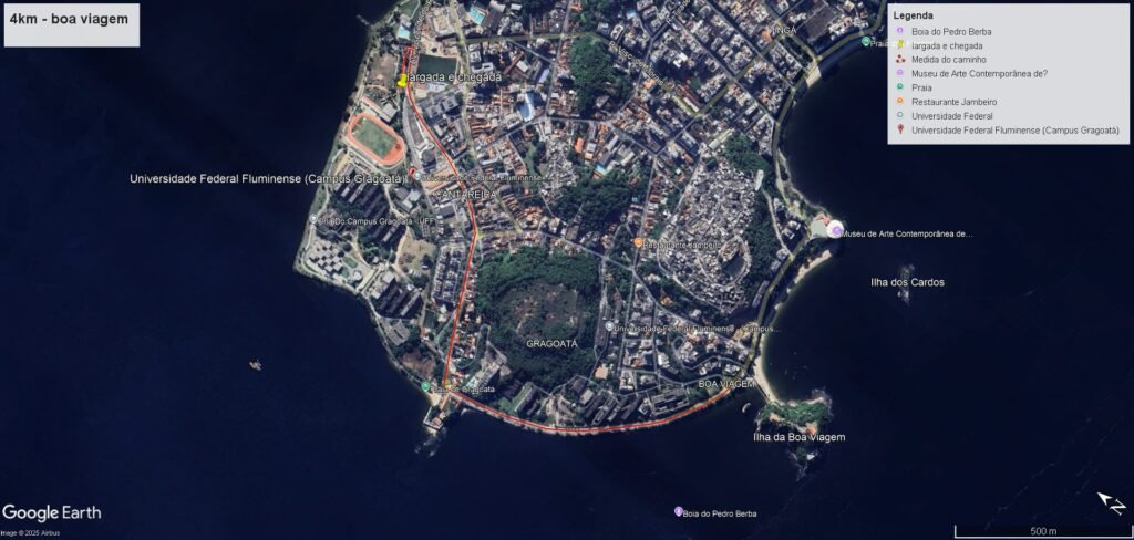 Largada e chegada na UFF CAMPUS DE EDUCAÇÃO FÍSICA (EM FRENTE A CONCHA ACÚSTICA) sentido Praia da Boa Viagem.